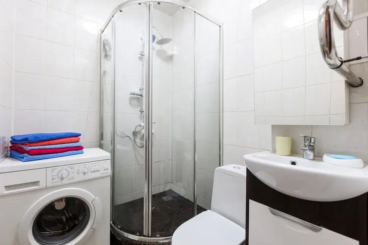 - Ziehen Sie bei Bedarf spezielle Kompaktgeräte in Erwägung, die weniger Platz einnehmen als eine gewöhnliche Waschmaschine. Solch ein Modell können Sie sogar unter einem Waschbecken verstauen, falls dieses sich ausgerechnet neben der Dusche befindet.