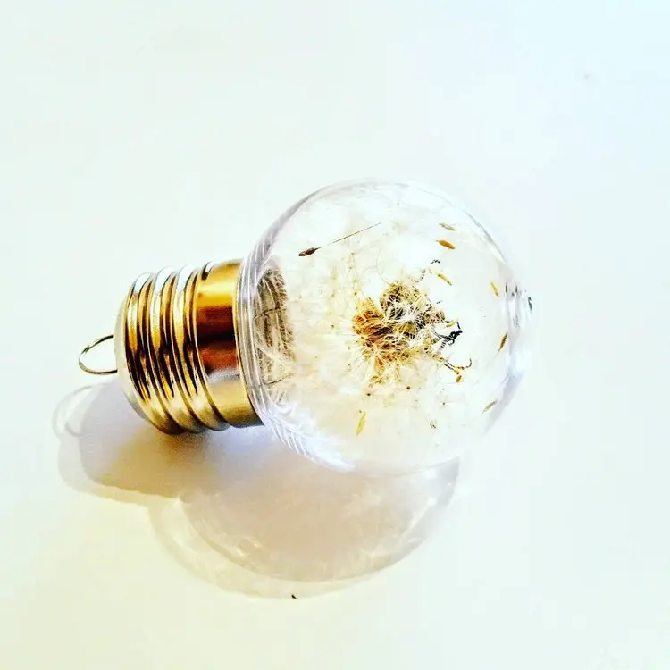 - Stecken Sie die Knospe in eine dekorative Glühbirne. Achten Sie darauf, eine Größe zu wählen, in der sich die Pusteblume später gut entfalten kann. Lassen Sie die Glühbirne am besten erst einmal geöffnet. Sobald sich die Samen entfaltet haben, geben Sie der Blume noch einige Tage (oder sogar 1-2 Wochen) Zeit, um zu trocknen, bevor Sie die Fassung wieder aufschrauben. Andernfalls staut sich die Feuchtigkeit, was zu Schimmelbildung führen kann.