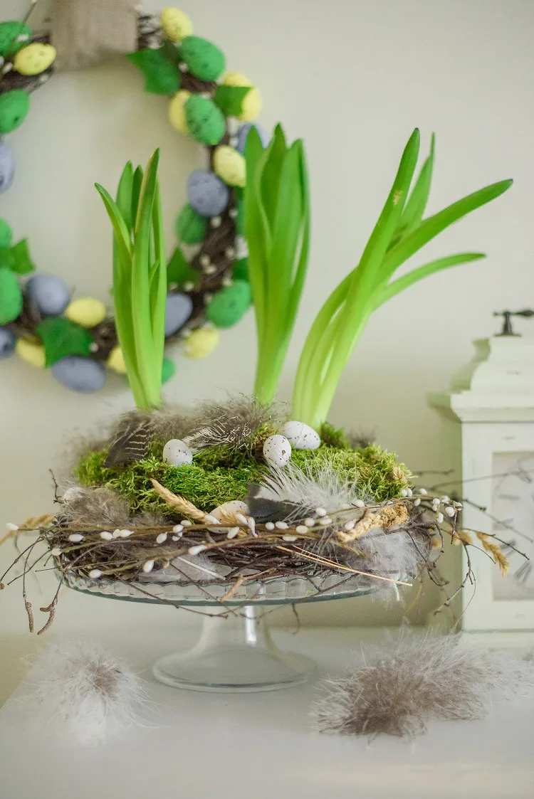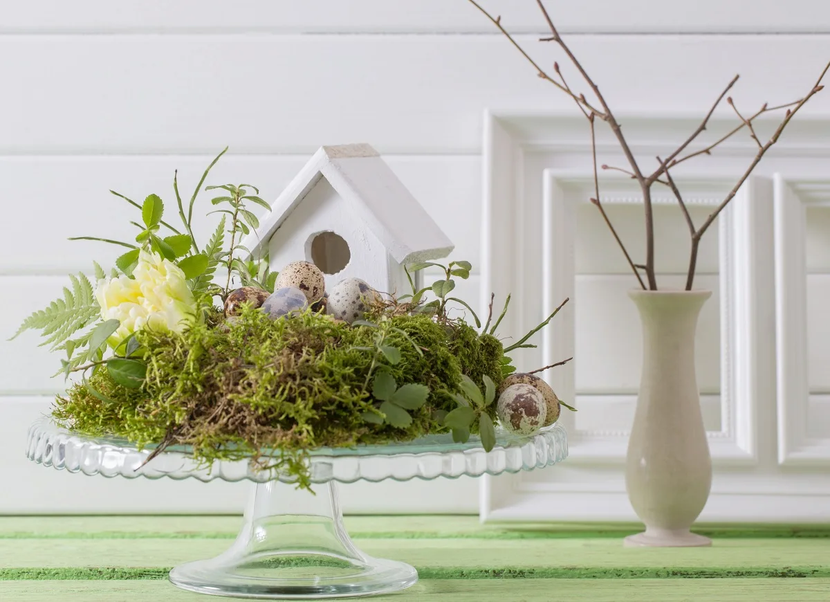 Ein Tortenständer aus Glas kann als Grundlage für ein zartes Gesteck aus weichem, grünem Moos, winzigen Wachteleiern, Federn und Frühblüher dienen. Verzieren Sie den äußeren Rand mit Weidenzweigen und getrockneten Pflanzen, um dem Ganzen eine organische und natürliche Note zu verleihen. Stellen Sie Ihren Tafelaufsatz auf eine helle Tischdecke und Sie haben die beste Ergänzung für jede saisonale Dekoration.