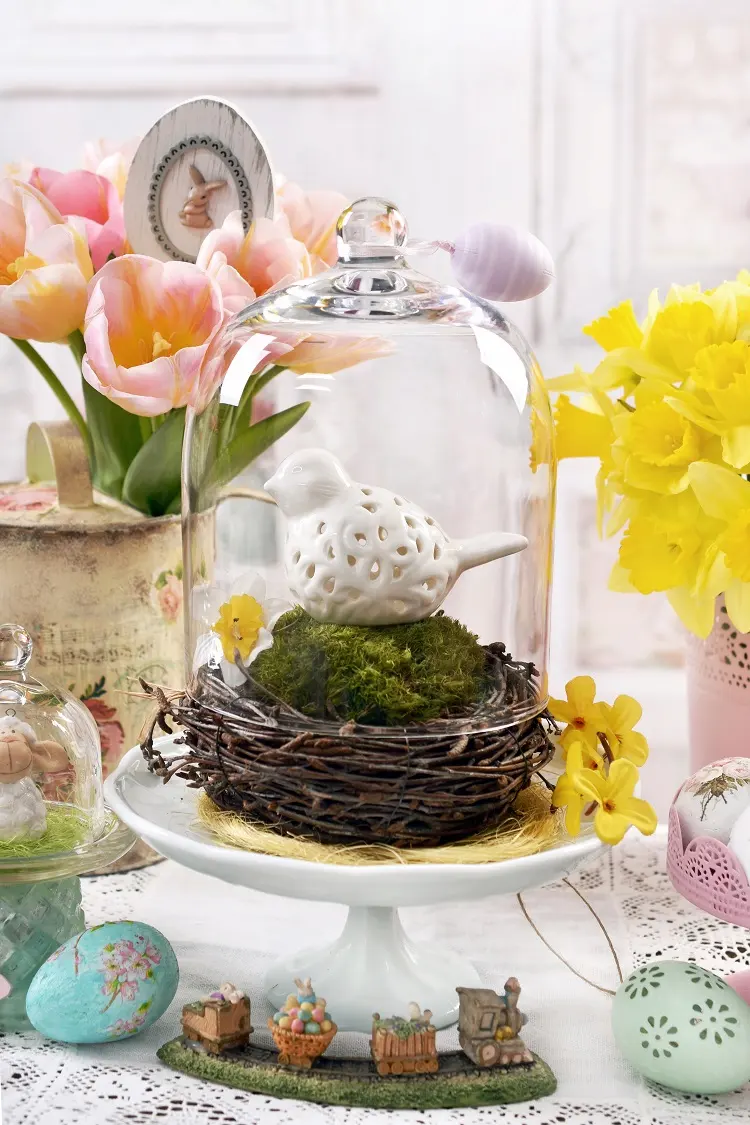 Diese vielseitige Deko-Idee bringt Höhe, Struktur und eine erfrischende Note auf Ihren Tisch oder Kaminsims. Kombinieren Sie einen weißen Tortenständer mit natürlichen Elementen wie Stroh, einem Vogelnest aus Weidenzweigen und Moos und fügen Sie niedliche Keramikfiguren unter einer Glasglocke hinzu, um einen eleganten und zugleich rustikalen Touch zu erzielen. Ergänzen Sie das Arrangement mit frischen Blumen wie Narzissen, Tulpen, Hyazinthen oder Schneeglöckchen und ein paar pastellfarbenen Eiern, wenn Sie diese Deko für die Osterzeit erfrischen wollen.