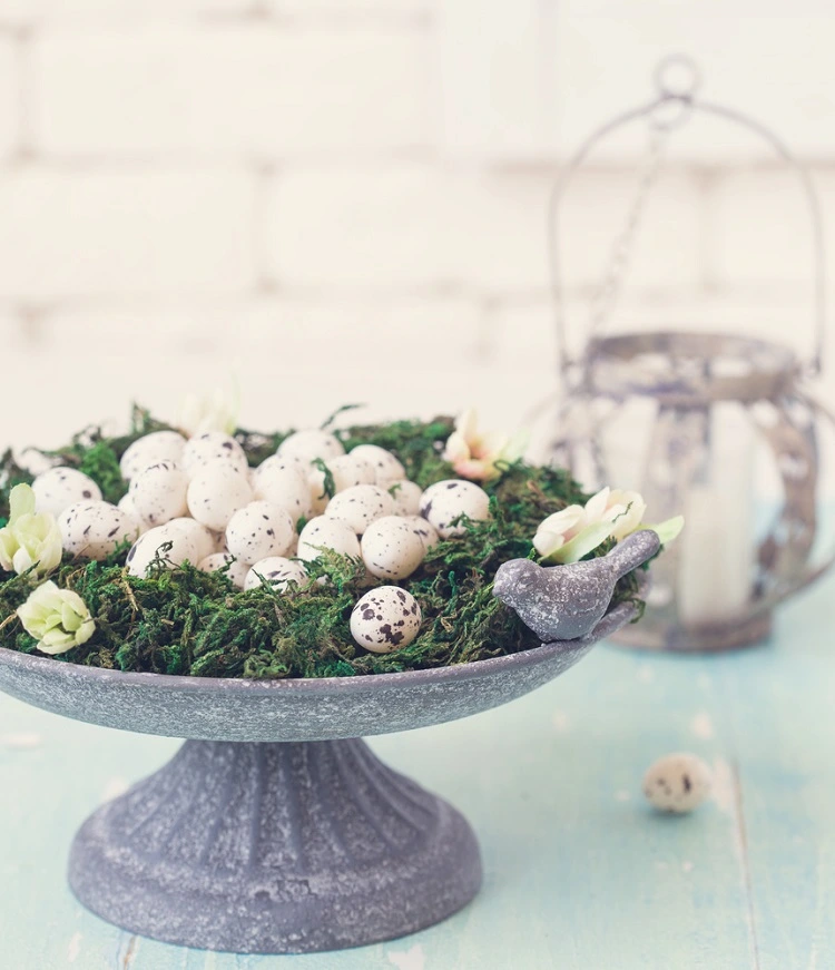 Für einen Vintage-Look arrangieren Sie ausgeblasene Wachteleier auf einem mit weichem Moos belegten Tortenständer. Stecken Sie Trocken- oder Frischblumen wie Schleierkraut, Wildrosen oder Lavendel hinein. Die Kombination aus Pastellfarben, natürlichen Strukturen und einem Hauch rustikaler Eleganz sorgt für einen charmanten Tafelaufsatz, mit dem Sie Ihren Tisch sowohl im Frühling als auch zu Ostern schmücken können.