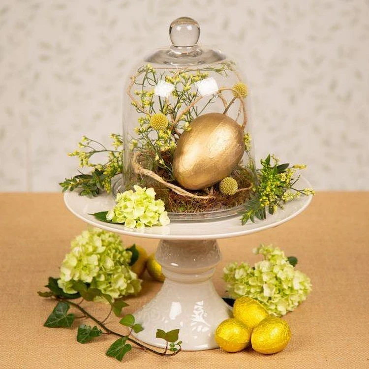 Nichts ist so frühlingshaft wie frische Blumen und eine der einfachsten Möglichkeiten, Ihre Deko aufzuwerten, ist die Gestaltung eines beeindruckenden Blumenarrangements. Mit einem Tortenständer können Sie jedoch nicht nur frühlingshafte Gestecke kreieren, sondern auch viele einzigartige Osterlooks gestalten. Fügen Sie ein goldenes Osterei unter einer Glasglocke hinzu und verleihen Sie Ihr Frühlingsarrangement einen ganz neuen festlichen Look.