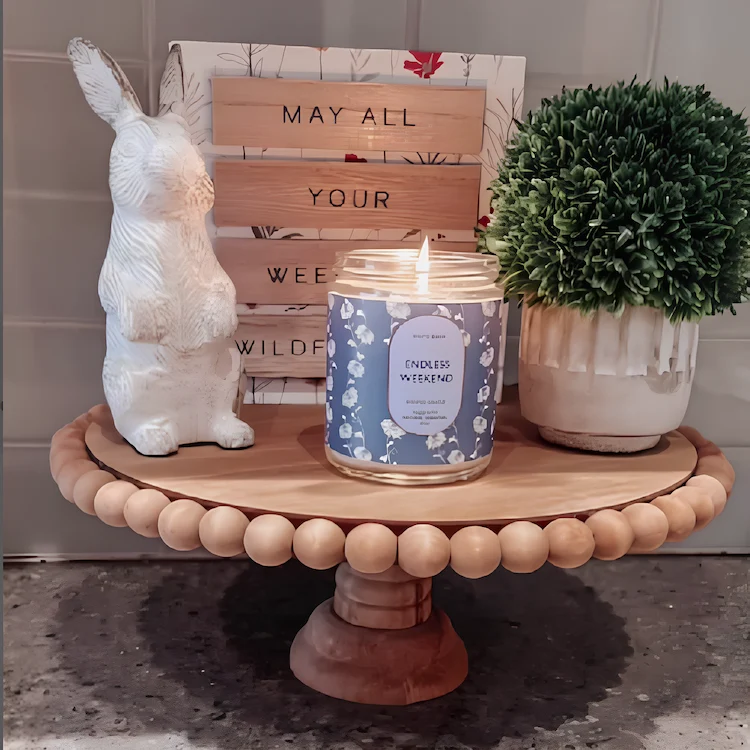 Für einen natürlichen, rustikalen Touch können Sie einen Tortenständer aus Holz als Basis für ein charmantes Arrangement verwenden. Stellen Sie eine Duftkerze darauf, um die Frühlingsatmosphäre zu verstärken. Fügen Sie eine kleine Topfpflanze wie eine Sukkulente oder einen Farn und eine Hasen- oder Vogelfigur aus Keramik oder Holz hinzu. Dieses einfache, aber elegante Arrangement verbindet den Charme eines Bauernhauses mit der frühlingshaften Ästhetik und eignet sich perfekt sowohl als Küchen- als auch als Wohnzimmerdekoration.