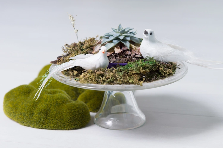 Für eine stilvolle und von der Natur inspirierte Frühlingsdeko schmücken Sie Ihren Tortenständer mit Moos und arrangieren Sie kleine Sukkulente für eine frische und erdige Ästhetik. Ergänzen Sie das Grün mit zarten weißen Taubenfiguren, die Frieden und Erneuerung symbolisieren. Dieses Arrangement eignet sich hervorragend als heiteres Mittelstück auf dem Esstisch oder als beruhigendes Dekoelement für den Wohnbereich und verleiht Ihrer saisonalen Deko einen organischen und anmutigen Touch.