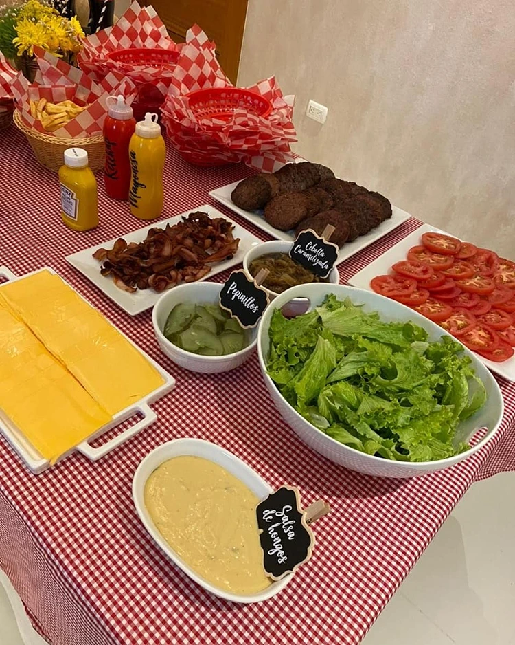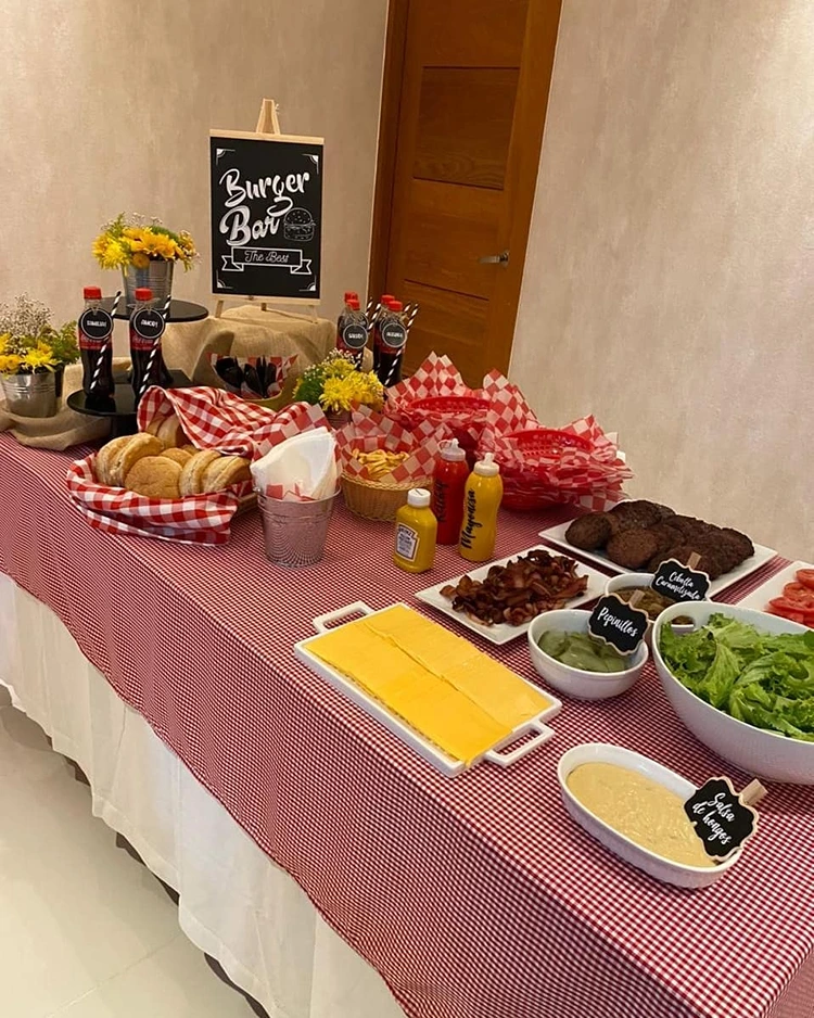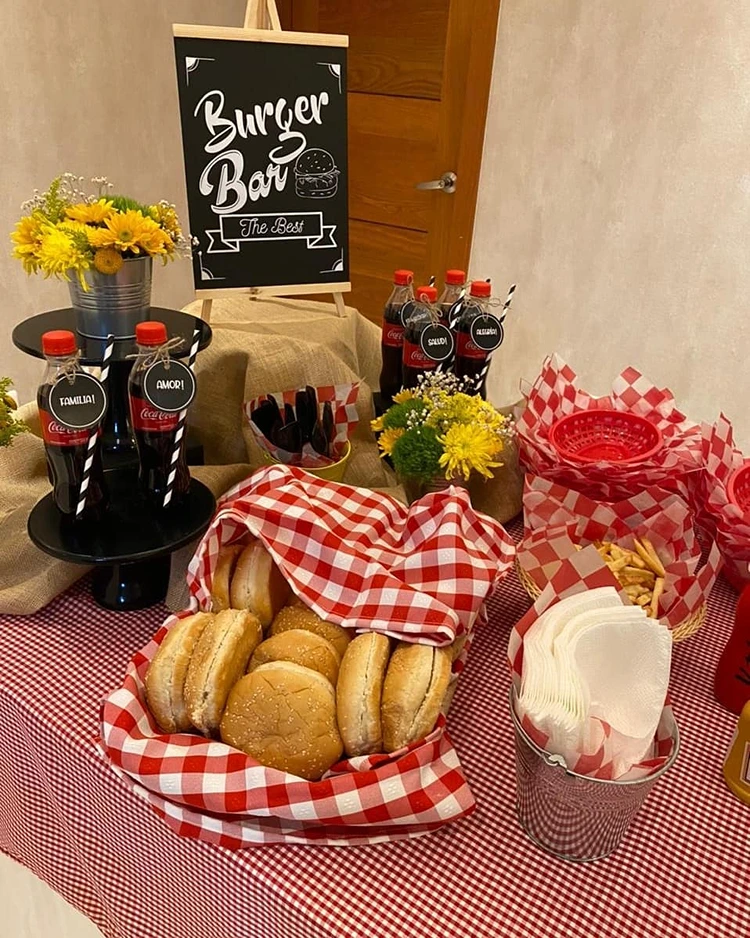 Verwenden Sie z. B. Naturmaterialien wie Holzkisten oder Leinentücher, um einen rustikalen Look zu erzeugen. Girlanden, kleine Wimpel, farblich abgestimmte Servietten und Ballons sorgen für gute Laune und lassen die Burger-Bar wie ein liebevoll gestaltetes Street-Food-Festival wirken.