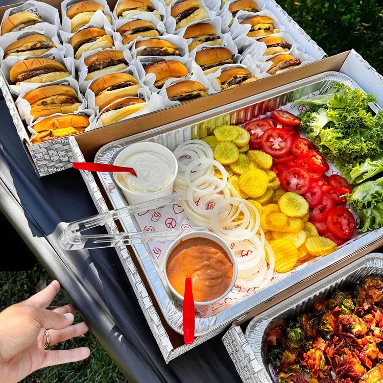 Aluschalen sind die perfekte Lösung, wenn Sie warme Burger-Zutaten wie Patties, Bacon, gebratene Zwiebeln oder auch gegrilltes Gemüse praktisch und flexibel bereitstellen möchten. Sie sind hitzebeständig, lassen sich einfach vorwärmen und passen sowohl in den Backofen als auch auf Warmhalteplatten oder Speisewärmer.