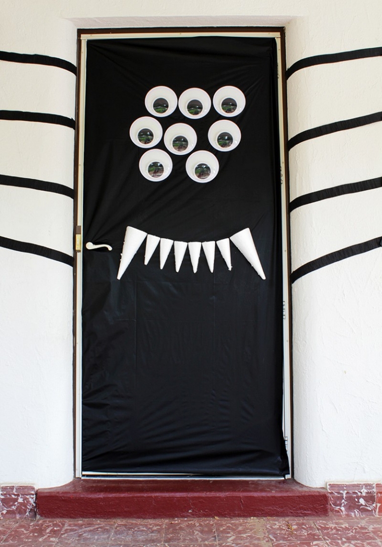Die erste Idee heißt die dumme Riesenspinne. Diese Türdeko lässt sich sehr leicht zu Hause auch mit Kindern erstellen. Dafür brauchen Sie eine schwarze rechteckige Tischdecke, 6 Papier Augen zum Aufkleben oder einfach 6 weiße Pappteller, einen 22×10 cm und drei 15×7 cm Styropor-Kegeln, schwarzes Klepppapier und doppelseitiges Klebeband.