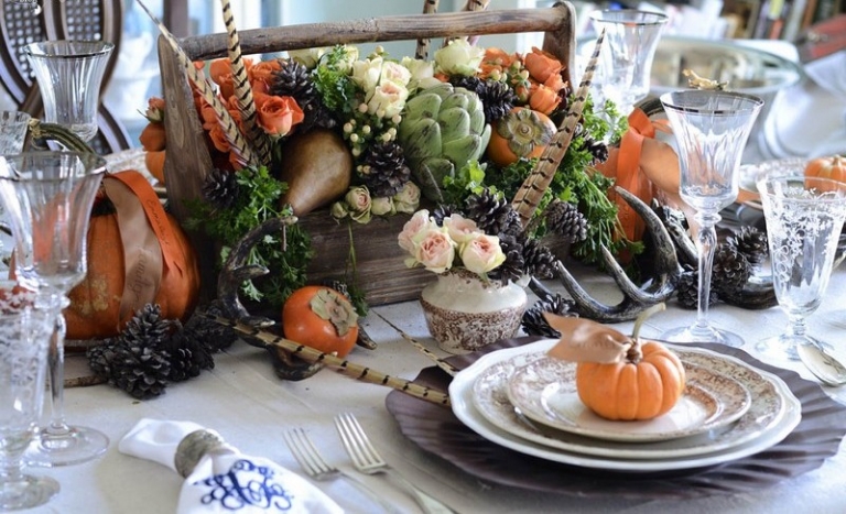Kombinieren Sie saisonale Obst und Gemüse /Zierkohl, Birne, Kürbisse, Granatapfel/ mit frischen Schnittblumen /Rosen, Nelken/ auf dem Herbsttisch. Für optimale Wirkung können Sie die Blumengestecke in einer Holzkiste arrangieren. Die passende Deko eignet sich perfekt für Vintage und Landhausstil-Einrichtungen. Charmant und einladend, so lässt sich das Erntedankfest feiern.