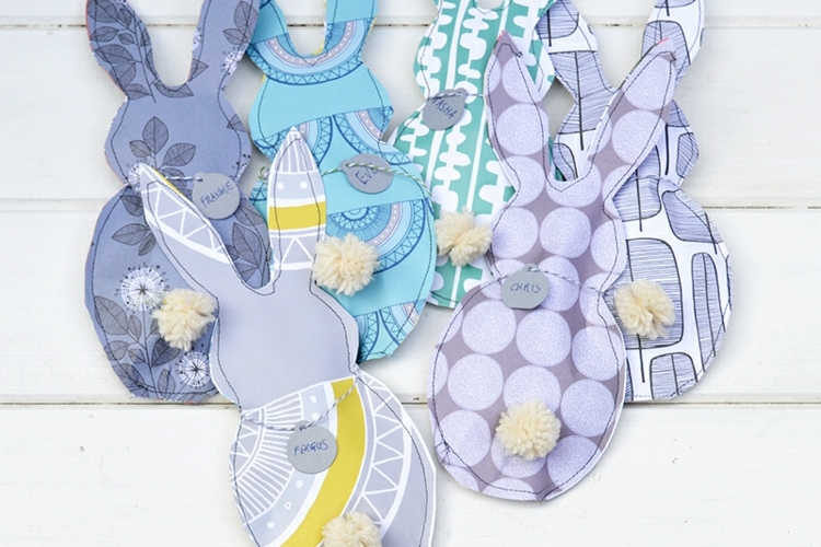 Legen Sie die zwei Häschen mit der falschen Seite aufeinander und nähen Sie die Kanten mit der Nähemaschine. Lassen Sie eine kleine Lücke, füllen die Osterleckereien und nähen die Öffnung zu. Aus kleinen Pompons können Sie die Schwänzchen machen und Schildchen mit dem Namen der Beschenkten aufhängen.