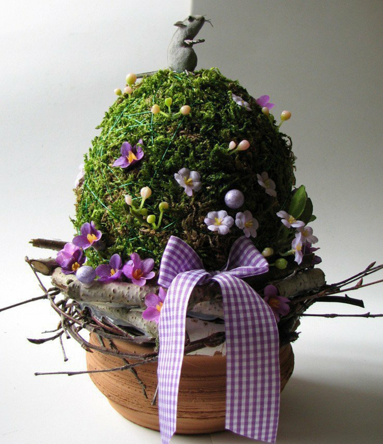Es gibt auch noch eine weitere Variante, mit der Sie ein solches Ei als Osterdeko basteln können. Es kann auch statt eines Styropor-Eis ein Ei aus Zweigen mit Moos bedeckt werden. Sicher haben Sie solche Modelle schon einmal in Geschäften gesehen. Ob Sie das Osterei aus Zweigen fertig kaufen oder selber machen, spielt keine Rolle. Es wird dann wie auch die Variante aus Styropor mit Moos beklebt (das wieder nach Belieben künstlich oder echt sein kann). Sollten hier die Zweige durchschimmern ist das nicht nur kein Problem, sondern sieht sogar sehr sympathisch aus.