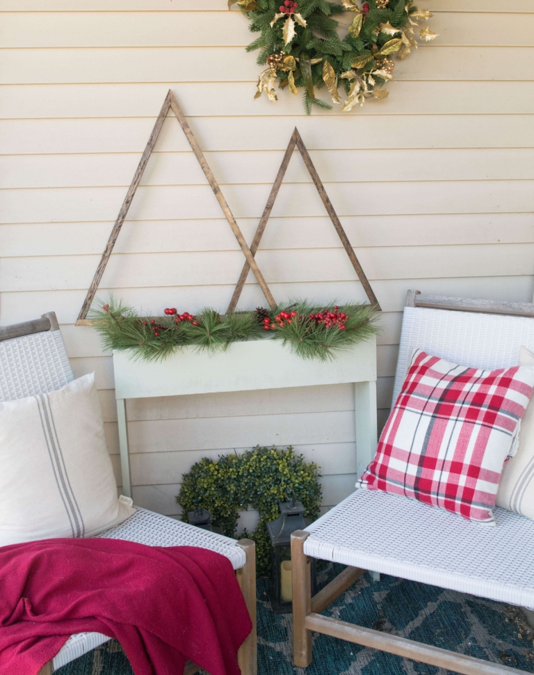 Ein Weihnachtsbaum gehört nicht nur im Haus, sondern kann auch den Außenbereich weihnachtlich dekorieren. Wählen Sie einen kleinen, künstlichen Weihanchtsbaum und schmücken Sie ihn mit wetterfesten Dekorationen.