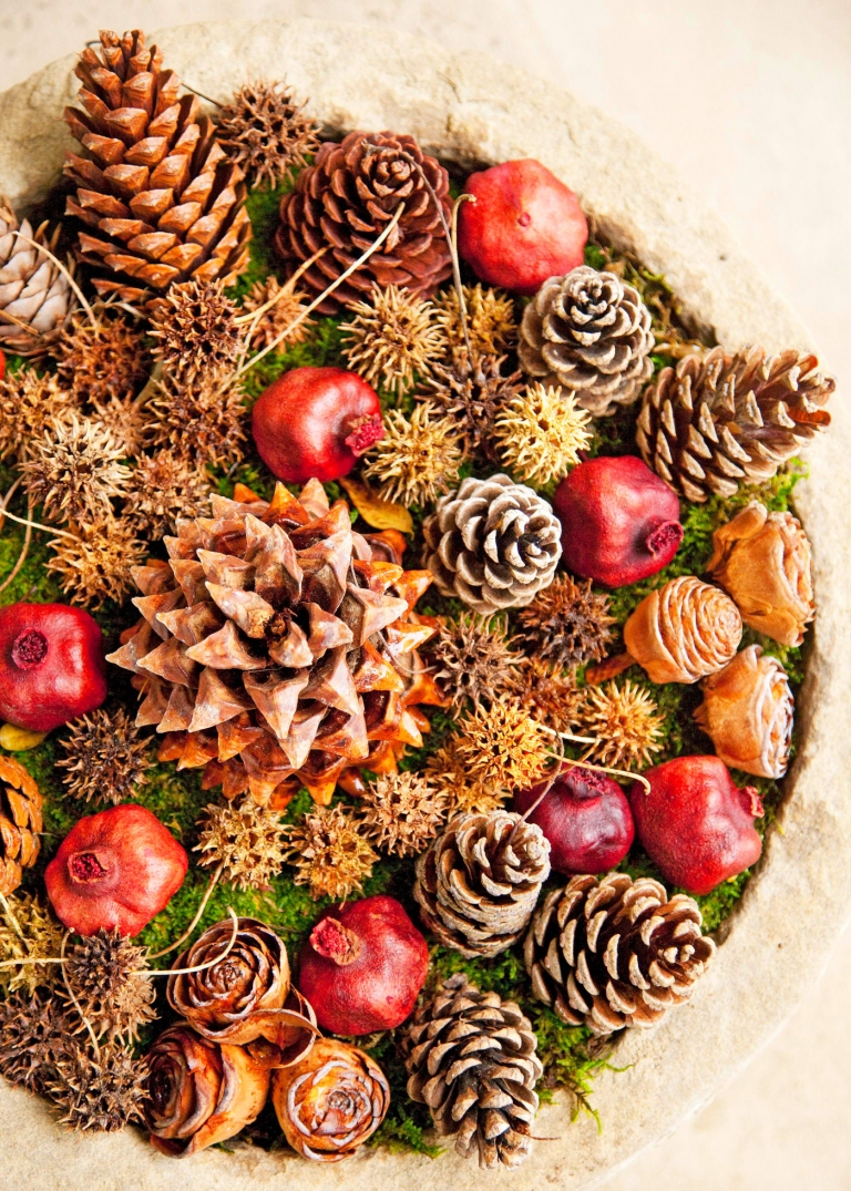 Das nächste Arrangement ist super einfach und selbst Anfänger können es problemlos selber machen. Tannen- und Kiefernzapfen zusammen mit Amberbaum-Zapfen und Hagebutte sind auf Islandmoos arrangiert. Die Dekoration kann in einer Schale, in einer Holzkiste, in einem breiten Blumentopf oder einfach auf dem Gartentisch arrangiert werden. Wer möchte, kann eine Lichterkette um die Zapfen drapieren oder eine Laterne mit Led-Kerze in die Mitte des Weihnachtsgestecks stellen.