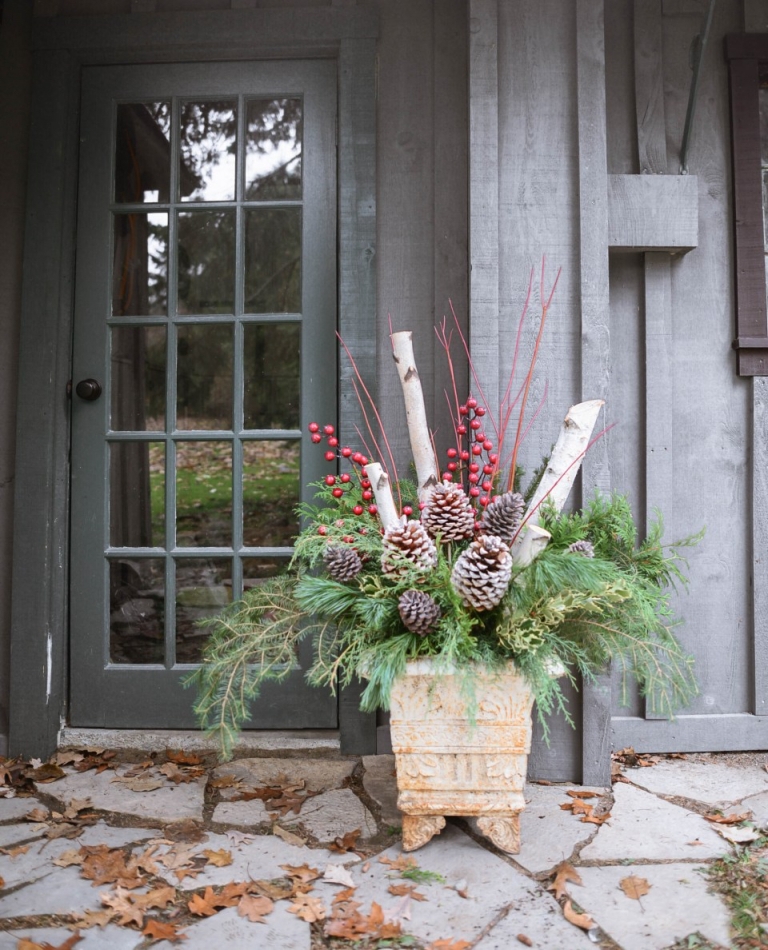 Sie möchten Ihren Hauseingang elegant, aber dennoch natürlich gestalten? Dann kombinieren Sie verschiedene immergrüne Sorten wie Pinie, Tanne und Zypresse mit silbernen Weihnachtskugeln, Engelshaar und weißen Akzenten. Birkenstämmchen sorgen für zusätzliche Höhe und machen das Arrangement optisch spannender. Besonders schön wirkt die Deko in hohen, schmalen Gefäßen neben der Haustür.