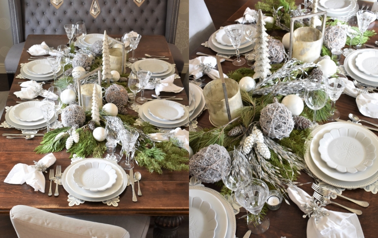Drapieren Sie als zuerst eine Girlande aus Tannenzapfen und Tannengrün in der Tischmitte. Besprühen Sie die Spitzen der Tannenzweigen mit Kunstschnee und die Tannenzapfen mit Farbspray in Silber. Arrangieren Sie dann um die Girlande verschiedene Dekoelemente: Tierfiguren, alte silberne Kugeln und Kristallsterne. Sie können mehrere Teelichter in Kupfer strategisch neben den Tellern platzieren, so dass die Gäste am Abend das sanfte Kerzenlicht genießen können.