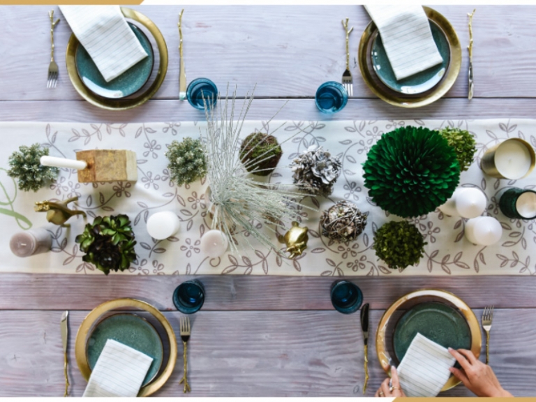 Festlich gedeckter Tisch zu Weihnachten: Moderne Tafeldeko in Grün und Gold