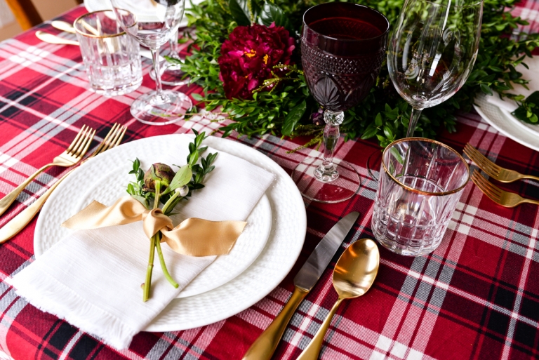 Festliche Dekoration im klassischen Stil mit verspielten Karo-Motiven und echten Blumen