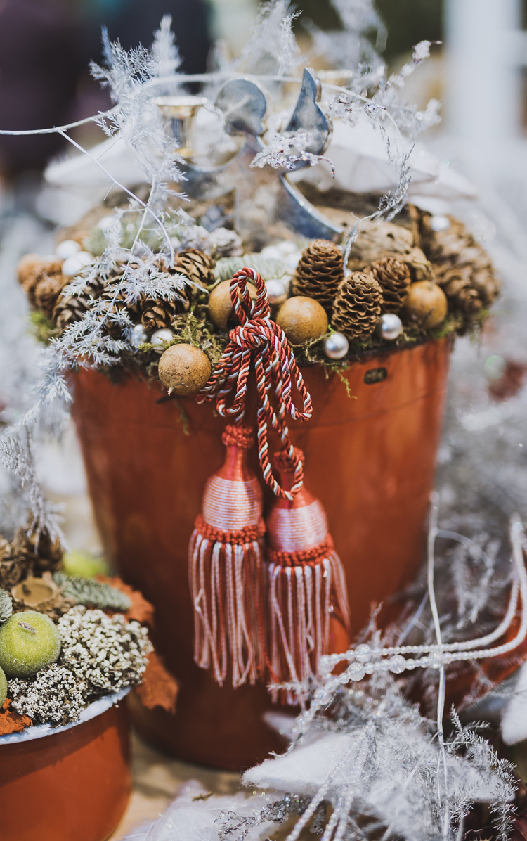 Weihnachtlich dekorieren im puristischen Stil Engel Figur und Tannenzapfen und Moos arrangieren