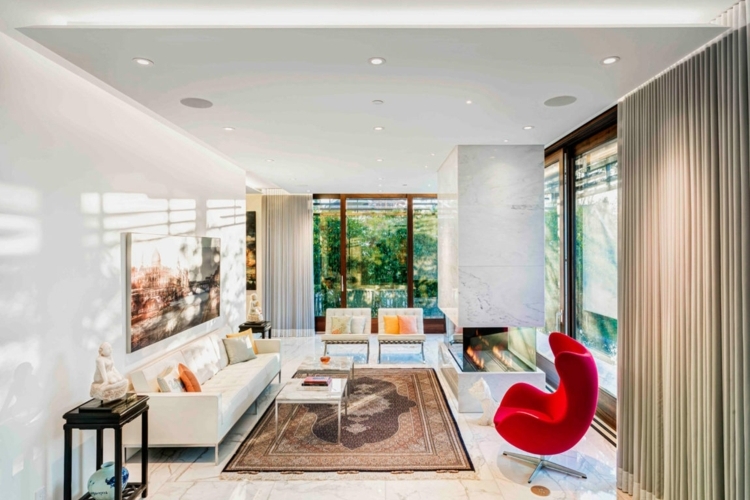 Der Marmor in Weiß findet sich in allen Räumen wieder und spielt dort mal eine große Rolle und dient mal als Akzent. Der gemütliche Sitzbereich, der sich gleich rechts nach dem Betreten des Hauses befindet, gehört zu jenen Bereichen des Hauses, wo der edle Naturstein nicht nur als Bodenbelag genutzt wurde. Auch zum Verkleiden des Kamins wurde er verwendet. In Kombination mit dem braunen Orientteppich entsteht hierbei ein perfektes Zusammenspiel von Eleganz und Gemütlichkeit, die durch die kunstvollen Dekorationen unterstrichen wird. Dasselbe gilt auch für den zweiten Sitzbereich im Erdgeschoss.