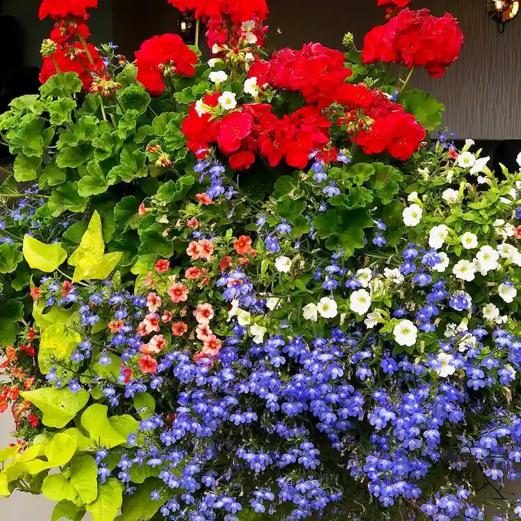 Eine knallbunte Pflanzkombination zum Verlieben: rote Geranien, Lobelien, Hängepetunien und Süßkartoffel verbreitet Lebensfreude und sorgt garantiert für gute Laune – den ganzen Sommer lang! Die Blütenfarben wechseln von Feuerrot der Geranien hin zu den zweifarbigen Hängepetunien. Die Blauen Lobelien setzen charmante Akzente und verleihen dem Ensemble das gewisse Etwas. Die attraktiven Blätter der Süßkartoffel sind die perfekten Lückenfüller im Kübel.