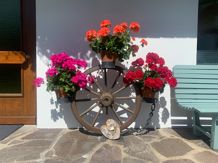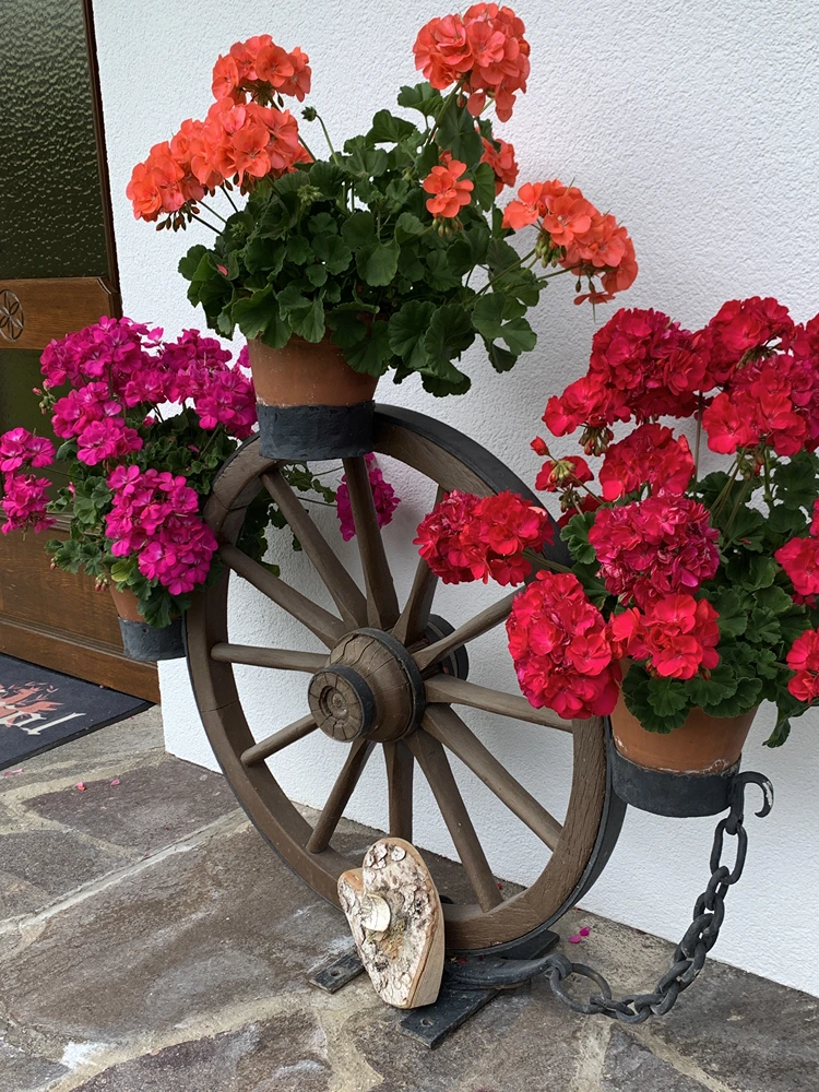 Dieses alte Wagenrad ist auf stabilen Beinen montiert. Es ist nun wie ein dekoratives Grundgerüst, ein Gestell mit Geschichte. Zwischen den Speichen hindurch fällt Licht, und durch seine Rundung entsteht ein Rahmen, der das dahinterliegende Grün kunstvoll einfängt. Quer durch das Rad ist ein rustikales Holzregal eingebaut, das perfekt zwischen die Beine gespannt ist. Darauf ruht ein großer Blumenkasten – aus Holz oder Zink – prall gefüllt mit üppigen Sommerblumen. Hängende Geranien wachsen nebeneinander und lassen ihre Blüten über den Rand des Kastens hinausquellen.