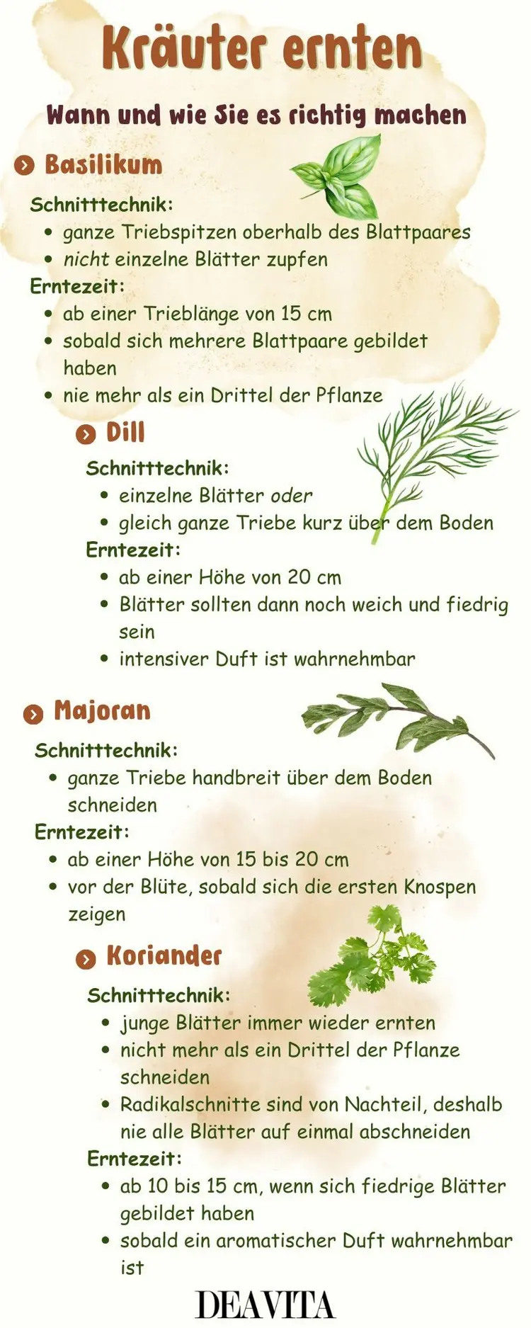 - bis kurz vor der Blüte ernten (vor der Blütephase am aromatischsten)