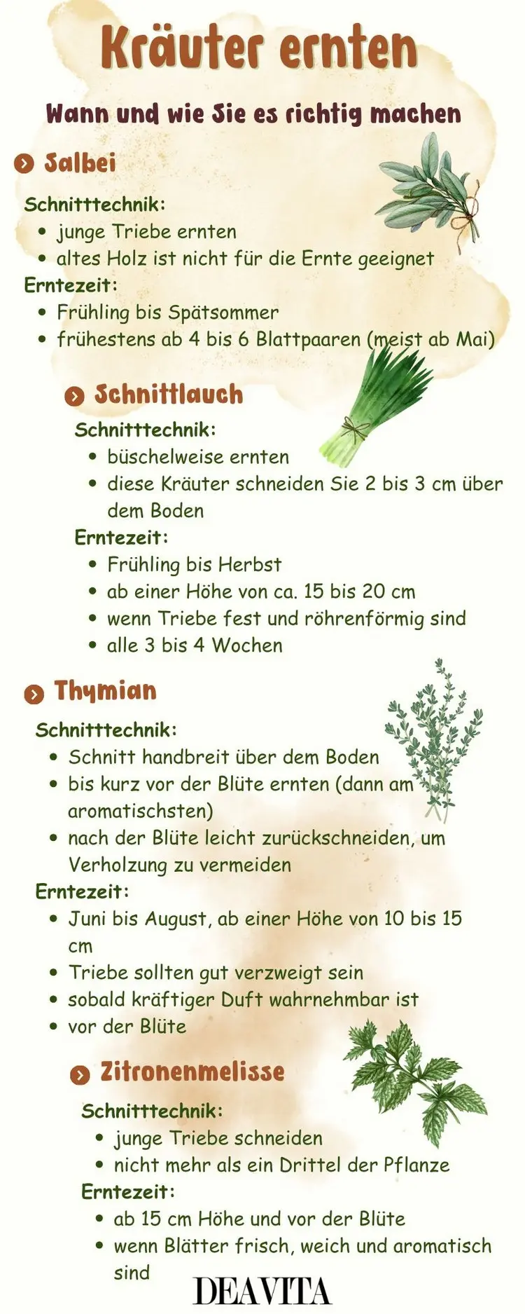 Schnitttechniken und Erntezeit zu Salbei, Schnittlauch, Thymian und Zitronenmelisse
