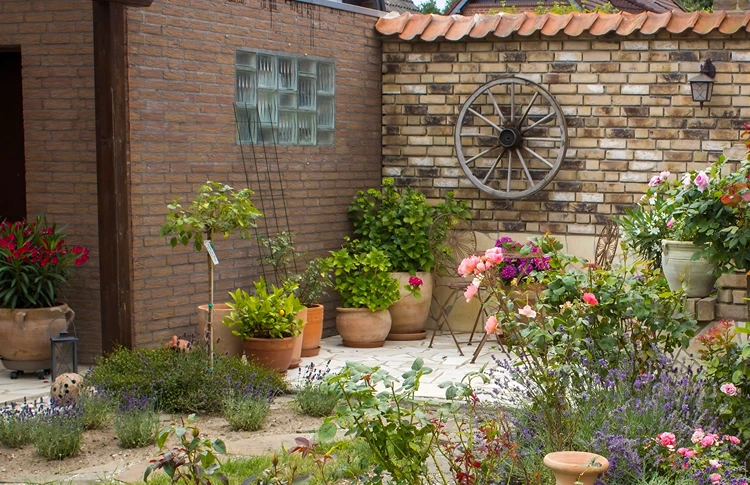 Der gezeigte Garten erinnert in seiner Gestaltung an einen romantischen Innenhof irgendwo in der Toskana. Eine gemauerte Wand mit Terracotta-Dachziegeln rahmt das Beet ein, ergänzt durch Natursteinplatten und dekorative Terracotta-Amphoren. Schon beim Betreten verströmt der Garten Urlaubsstimmung pur.