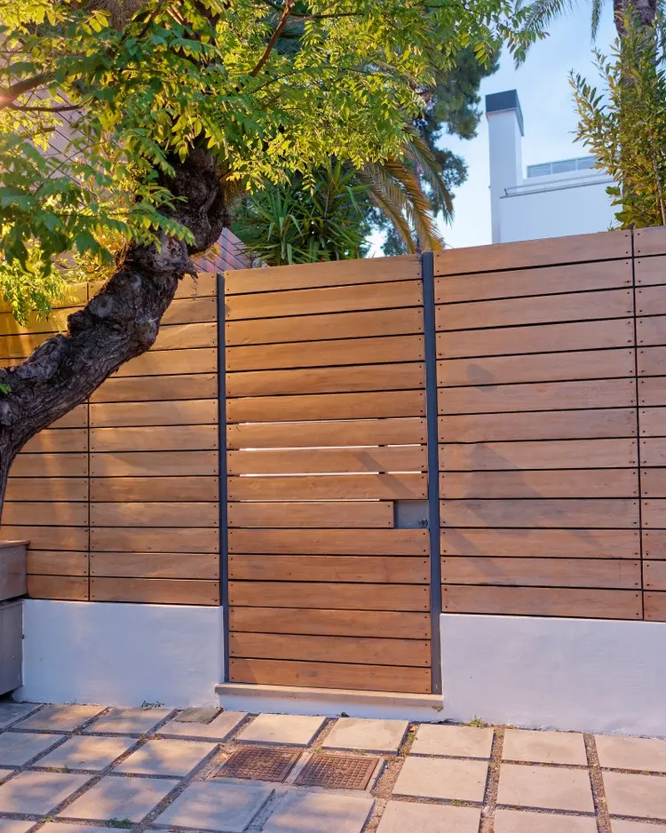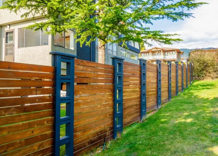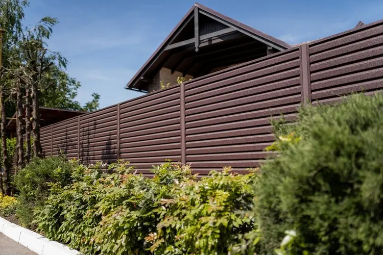 Moderner mittelhoher Zaun mit Metallgerüst und Holzlatten