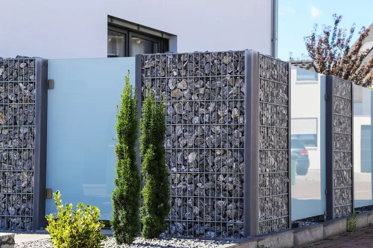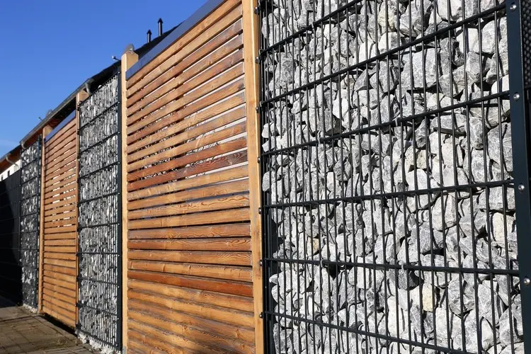 Sichtschutzzäune aus Holz, kombiniert mit Gabionen aus schwarzem Metall und grauen Steinen