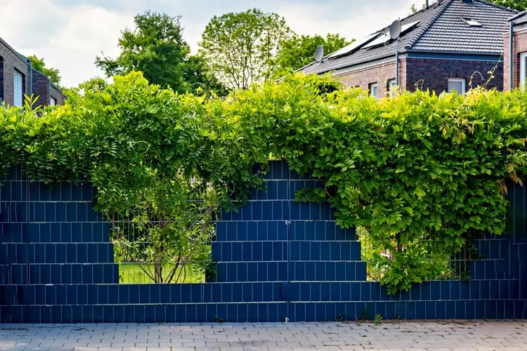 Doppelstabmattenzaun teilweise mit Sichschutzstreifen versehen und offene Bereiche für Pflanzen lassen