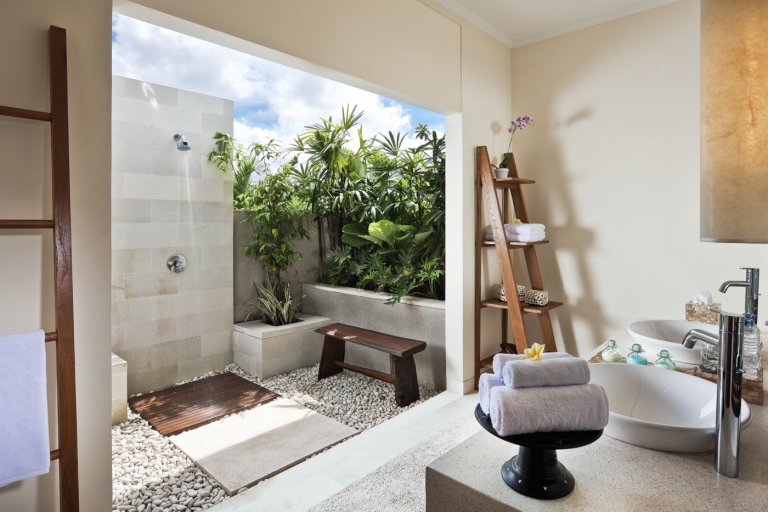 Im Unterschied zum exotischen Ferienhaus gibt es in Deutschland starke Temperaturunterschiede. Bereits im Herbst ist es nicht mehr angenehm, draußen zu baden oder zu duschen. Im Winter ist es sogar gar nicht möglich. Wenn Sie aber ein Badezimmer im Erdgeschoss haben, können Sie den Raum durch große Schiebetüren aus Glas zum Garten öffnen. So verschmilzt die Grenze zwischen dem Innen- und dem Außenbereich in den Sommermonaten und im Winter können Sie die Türen schließen und ihre warme Badeoase genießen.