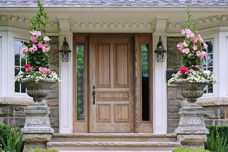 - Klassische Steinvasen auf Podesten: wirken edel und formal, perfekt für symmetrische Gestaltung an Haustüren.