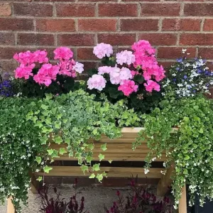 Geranien (Pelargonium) in Pink oder Rot greifen die Farben der Dipladenia auf und sorgen für Volumen im Topf – ideal für klassische Fassaden.