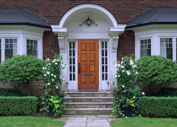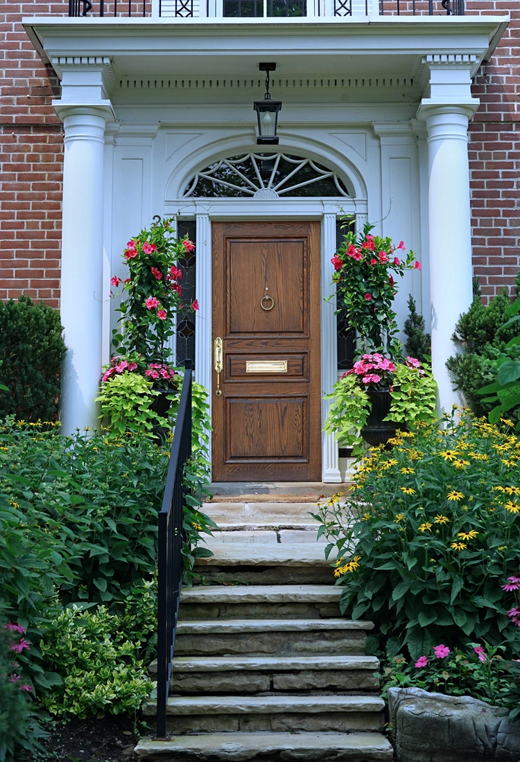 Besonders beeindruckend sind die beidseitigen Arrangements rechts und links der Haustür – sie schaffen sofort ein Gefühl von Ordnung, Eleganz und Willkommenskultur. Ideal für klassische Architektur.