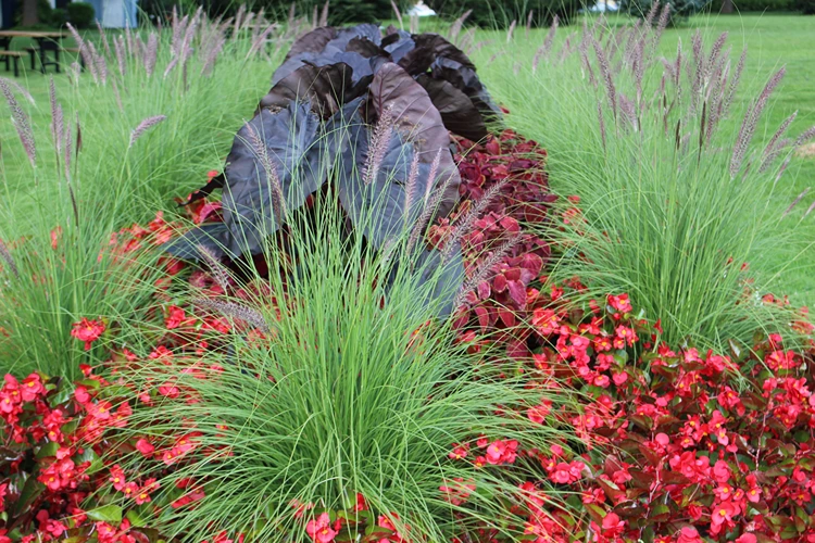 Wer es gerne grafisch mag, wird an dieser Idee Gefallen finden: kreisförmig bepflanzte Beete mit Begonien in mehreren Farben, umrahmt von einem kräftigen Gräserzentrum.