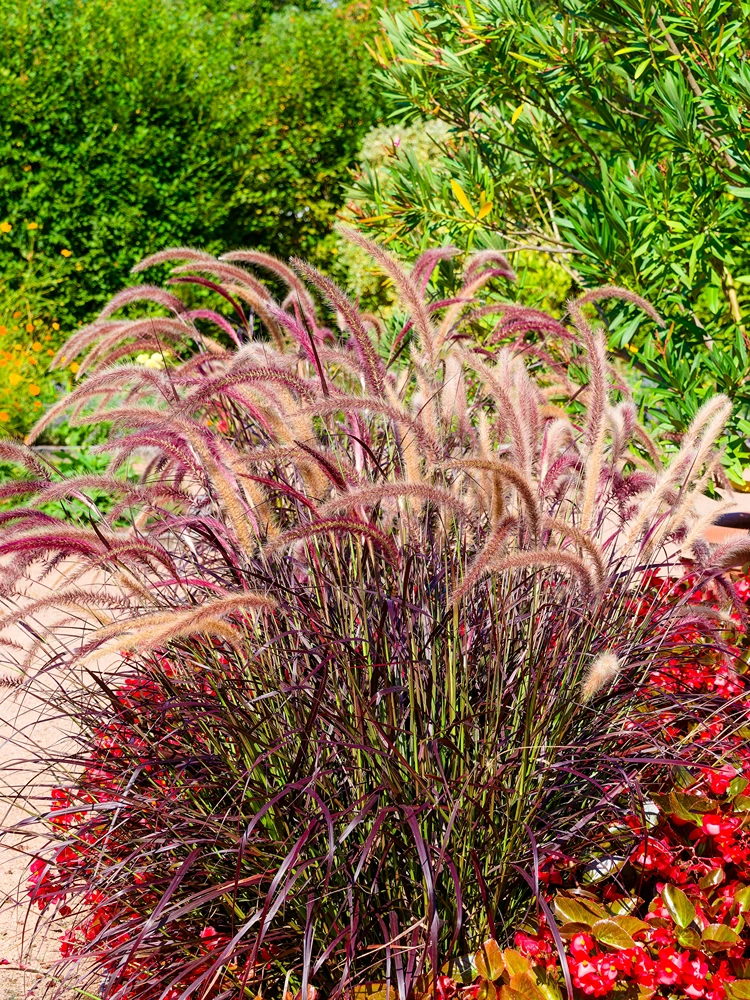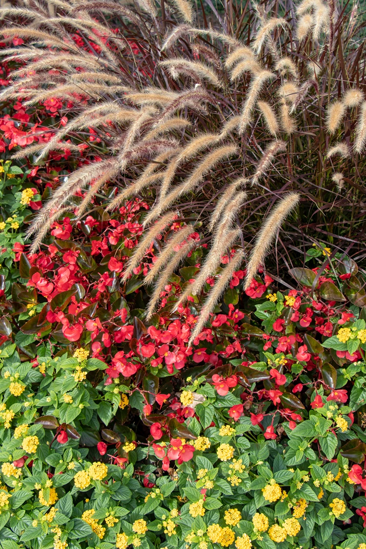 Dieses Beet lebt vom Kontrast: Leuchtend rote Begonien (Begonia semperflorens) bilden einen dichten Blütenteppich im Vordergrund, darüber wiegen sich die filigranen Ähren des Lampenputzergrases (Pennisetum alopecuroides) im Wind. Die Gräser bringen Höhe und Bewegung, während die Begonien für Ordnung und Farbe sorgen.