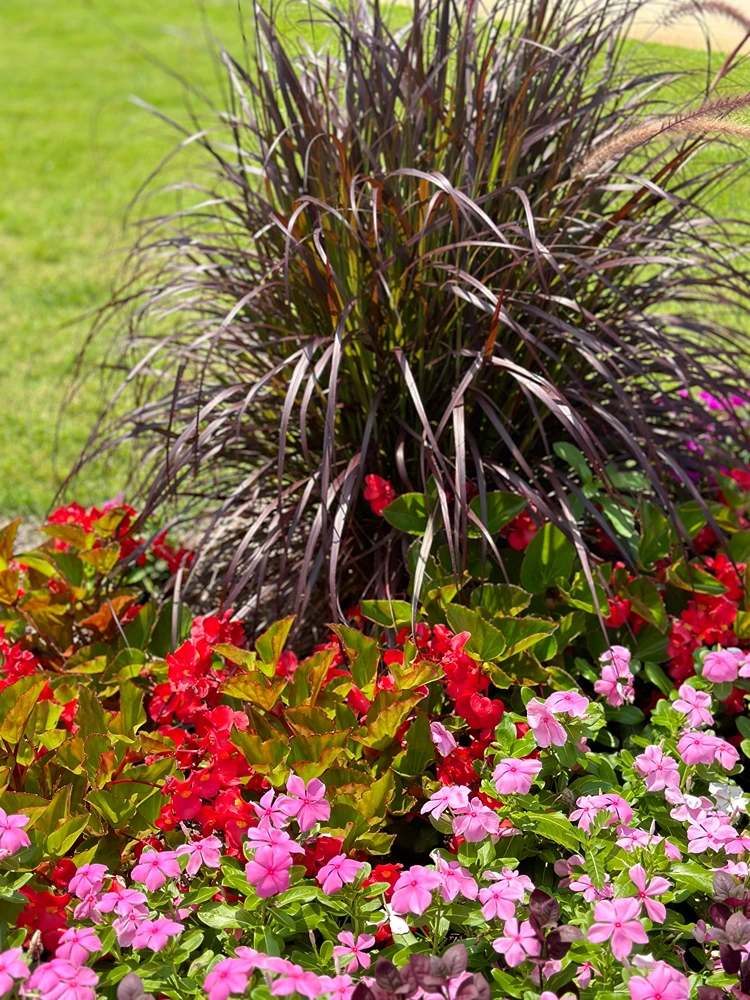Die Gräser bringen Leichtigkeit und Tiefe ins Beet, während die Begonien für Struktur sorgen. Ein dunkelvioletter Blattschmuck im Hintergrund – etwa Iresine – setzt einen ruhigen Kontrast, der das Farbspiel noch stärker betont.