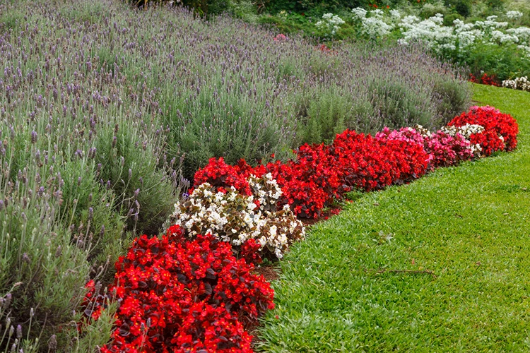 Wenn Ihnen formale Gärten zu streng sind, könnten Sie an dieser eher verspielten Kombination Gefallen finden: flächig gepflanzte Begonien (Begonia semperflorens) in Rosa und Weiß im Vordergrund, dahinter ein lockerer Streifen Lavendel (Lavandula angustifolia).