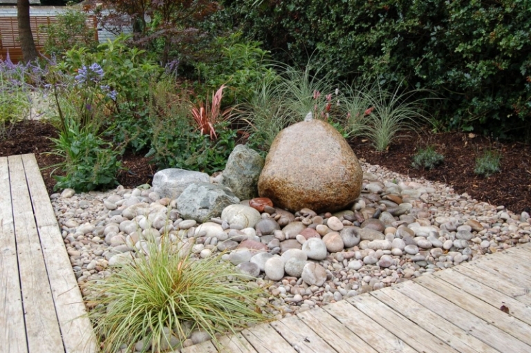 Moderne Gartengestaltung mit Zierkies, Gräsern und Steinen