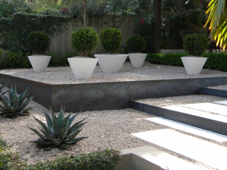 Der moderne Garten ist im minimalistischen Stil angelegt – Sukkulente und Wüstenpflanzen ersetzen erfolgreich das traditionelle Blumenbeet, die Terrasse ist mit Holzboden verlegt, die Möbel sind schlicht, aber sehr elegant und hochwertig. Der Außenbereich wird in mehreren Zonen je nach der Funktion aufgeteilt und wirkt daher gut strukturiert. Geometrische Formen bringen gerade diese angesagte minimalistische Struktur und lassen den Garten optisch größer wirken. Der Einsatz von Naturmaterialien kreiert eine entspannte Atmosphäre -Holz, Naturstein und Kies bilden ein reizvolles Ensemble. Und gerade hier kommen die vielen Einsatzmöglichkeiten vom Kies zur Geltung.