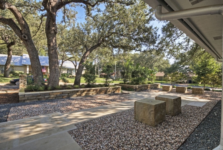 Dieser Sitzbereich imitiert auf wunderbare Weise ein Loch mit Rissen an den Seiten. Gestaltet wurde das lediglich aus Steinplatten in natürlicher Form und grauem Kies. Letzteres dient auch als Füllmaterial für einen der zwei Gartenwege. Diese bestehen im Übrigen aus modernen Steinplatten in weißer Farbe, die auf originelle Weise in den Bodenbelag des Sitzbereichs eingearbeitet wurden.