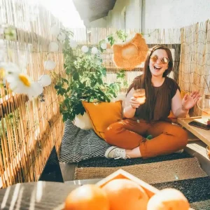 Feuerschale aus Kortenstahl und Sitzsack auf der Kiesterrasse