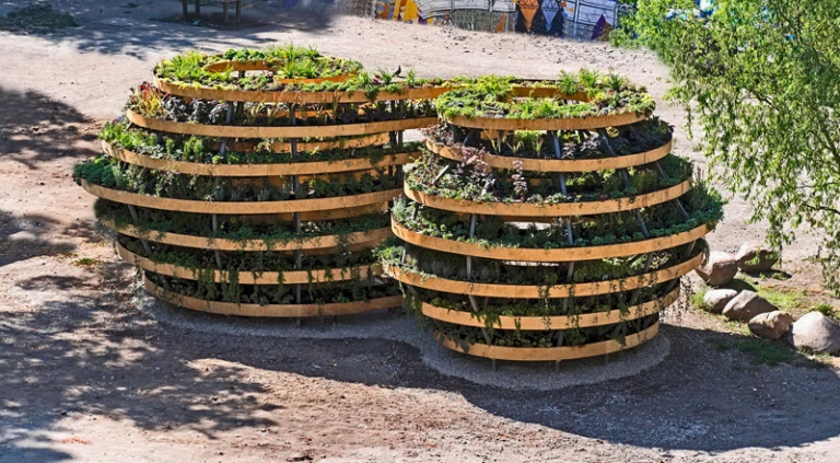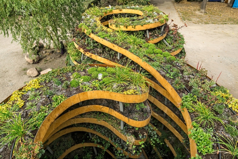 Die Konstruktion ist mehr als drei Meter hoch und besteht aus einem Metallgestell und Holzkasten. Gleichzeitig ist die eigenartige Spirale eine platzsparende Alternative und kann in Zukunft auch in Innenhöfen von öffentlichen Gebäuden, an Bushaltestellen, und praktisch überall, wo gewünscht, gebaut werden. Wir sind auf jeden Fall vom Projekt total begeistert!