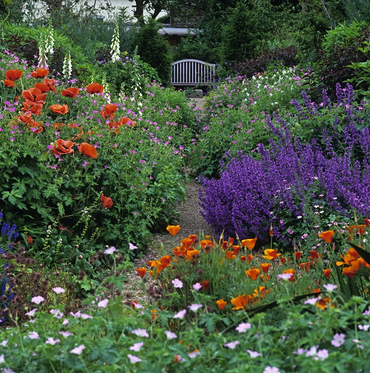Für alle, die es gerne natürlich und ein bisschen wild mögen: Katzenminze ist im Cottage-Garten ein Muss. Zusammen mit mit rotem Mohn (Papaver orientale), rosa Pyrenäen-Storchschnabel (Geranium endressii) und weißem Fingerhut (Digitalis purpurea) entsteht ein lebendiges Staudenbeet, das pure Sommerfreude ausstrahlt.