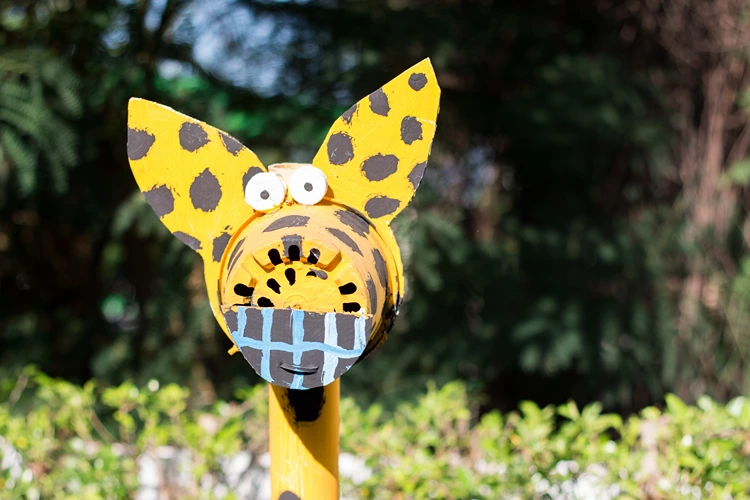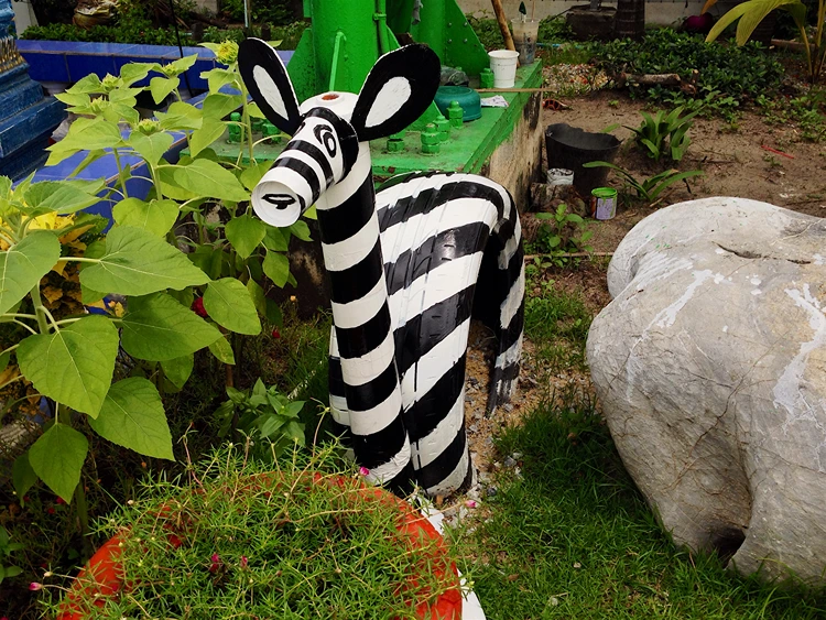 Dieses Upcycling-Zebra wirkt charmant und kreativ – sein Körper besteht aus einem weiß gestrichenen Autoreifen mit schwarzen Streifen. Aus dem Reifen ragt ein senkrechtes Rohr als Hals empor, ebenfalls weiß-schwarz gestreift. Oben sitzt ein aufgeklebter Becher als Kopf, liebevoll bemalt, mit Augen und einem fröhlichen Grinsen. Zwei aufgesetzte Ohren aus Stoff oder Draht machen die Figur komplett.