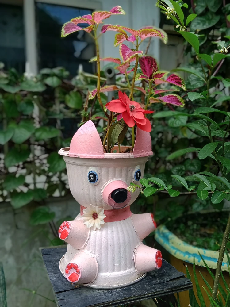 Ein rosa Schweinchen aus Blumentöpfen sitzt fröhlich im Garten – der runde Körper besteht aus einem größeren Topf, darauf ein kleinerer als Kopf. Vier Mini-Töpfchen bilden die Beinchen, die seitlich leicht abstehen. Das Gesicht ist freundlich bemalt, mit großen Wackelaugen, mit einem runden Rüsselnäschen.