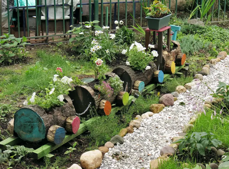 Manchmal darf es im Garten auch mal ein bisschen ausgefallener sein – wie wäre es mit einem selbstgebauten Blumen-Zug? Diese originelle Gartendeko besteht aus grob zugeschnittenen Baumstämmen, die wie Waggons aneinandergereiht sind. Jeder „Wagen“ wurde bunt bemalt und liebevoll bepflanzt – mit Petunien, Geranien und anderen saisonalen Blüten.
