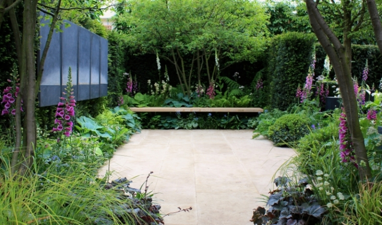 Der neue minimalistische Trend in der Gartengestaltung besagt – klare Formensprache! Gerade nach diesem Motto wurde auch der oben abgebildete Garten angelegt. Selbst den Laubbäumen vor der Terrasse wurde einen Formschnitt verpasst. Eine hohe Hecke schützt vor neugierigen Blicken, während sich die Gartenbesitzer drinnen neben dem lauschigen Blumenbeet hinsetzen oder am Rasen hinlegen können. Der Buchsbaum, symmetrisch an den vier Rasenecken gepflanzt, verleiht den letzten Schliff.