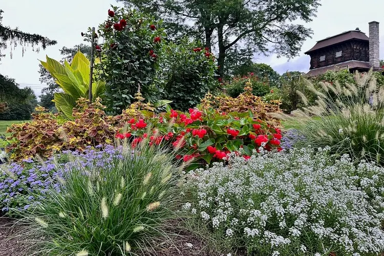 Roten Begonien, violettes und weißes Steinkraut (Alyssum) und Ziergräser