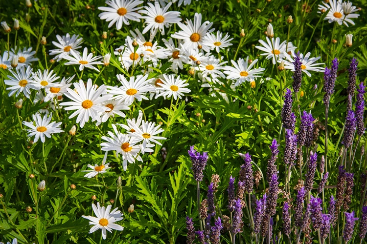 - Lavendel: Seine bläulich-violetten Blüten und das silbrige Laub sind ein schöner Kontrast zu den weißen Margeriten. Beide lieben Sonne und durchlässigen Boden.